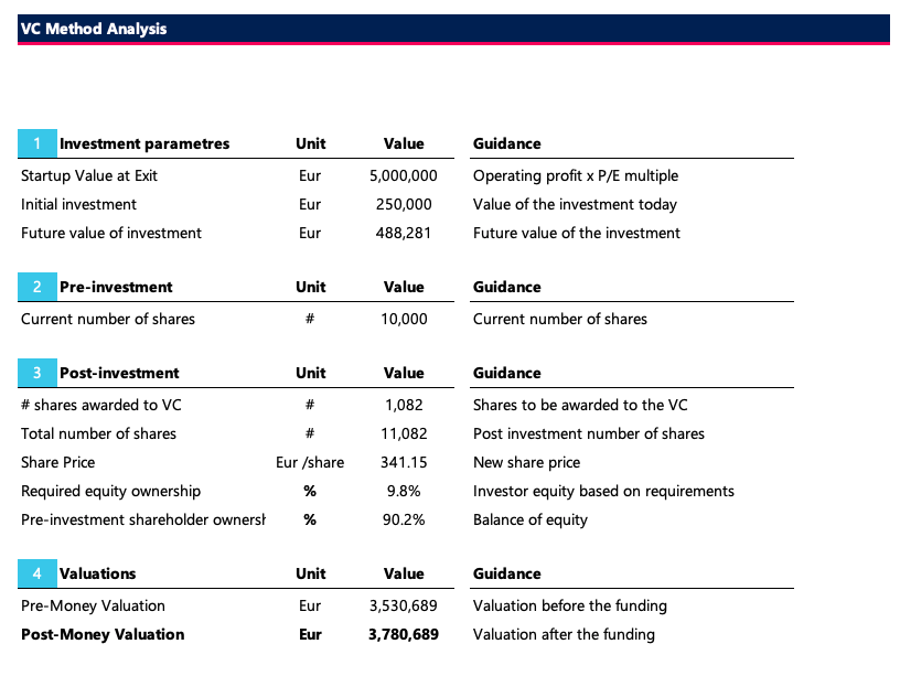 There are many ways to put a value on your business - the VC method is useful to understand how a VC would quickly value your business and it will give you an indication of your pre (and post) money valuation.