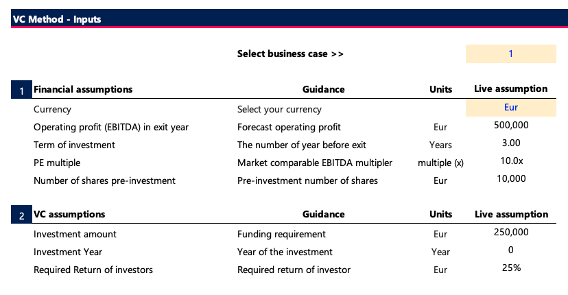 Pre-requisites - to get the most from this analysis, it is important that you have an idea of your forecast operating profit in your exit year and also an exit multiple. The VC will identify similar companies, in sector and stage, as the investment opportunity.