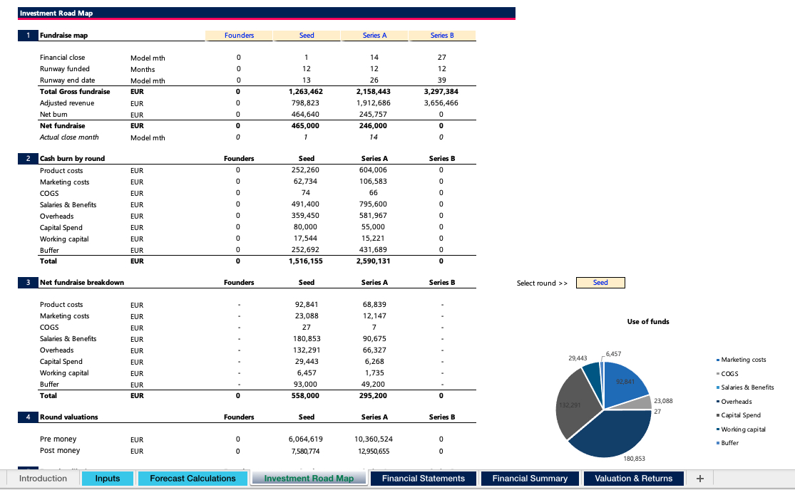4/ Investor road map - understand your cash shortfall, investment rounds, dilution analysis, and round valuations