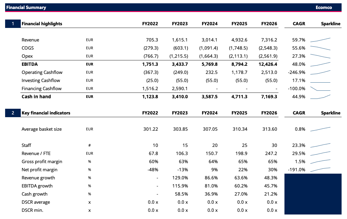 The well-designed model focusses on building your key revenue drivers, designing product pricing and margin, understanding the number and size of your finance rounds and giving you a business valuation (multiples and perpetual growth methods) - pitch ready and everything an investor needs to quickly and easily evaluate your E-commerce business.